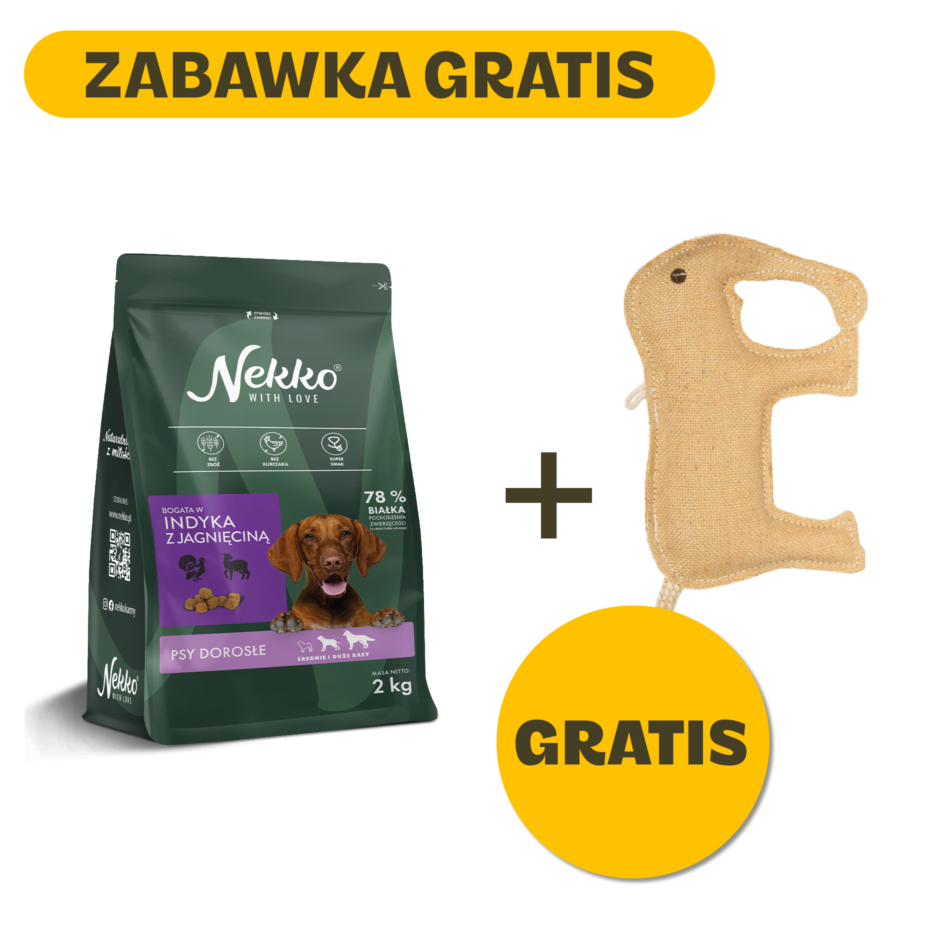NEKKO karma sucha dla psów dorosłych bogata w indyka z jagnięciną + Zabawka z juty Chico Trend – Słoń 15 cm