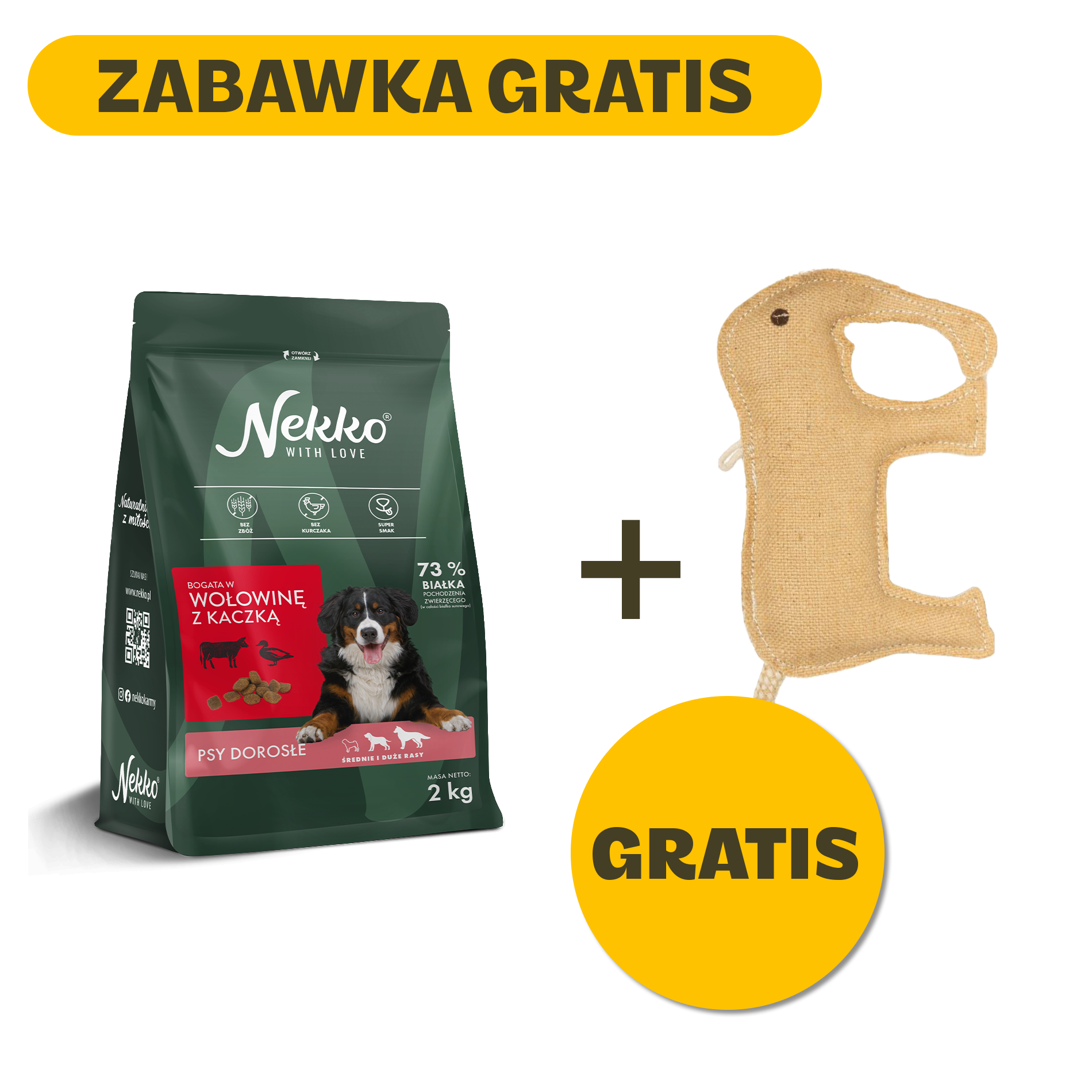 NEKKO karma sucha dla psów dorosłych bogata w wołowinę z kaczką + Zabawka z juty Chico Trend – Słoń 15 cm