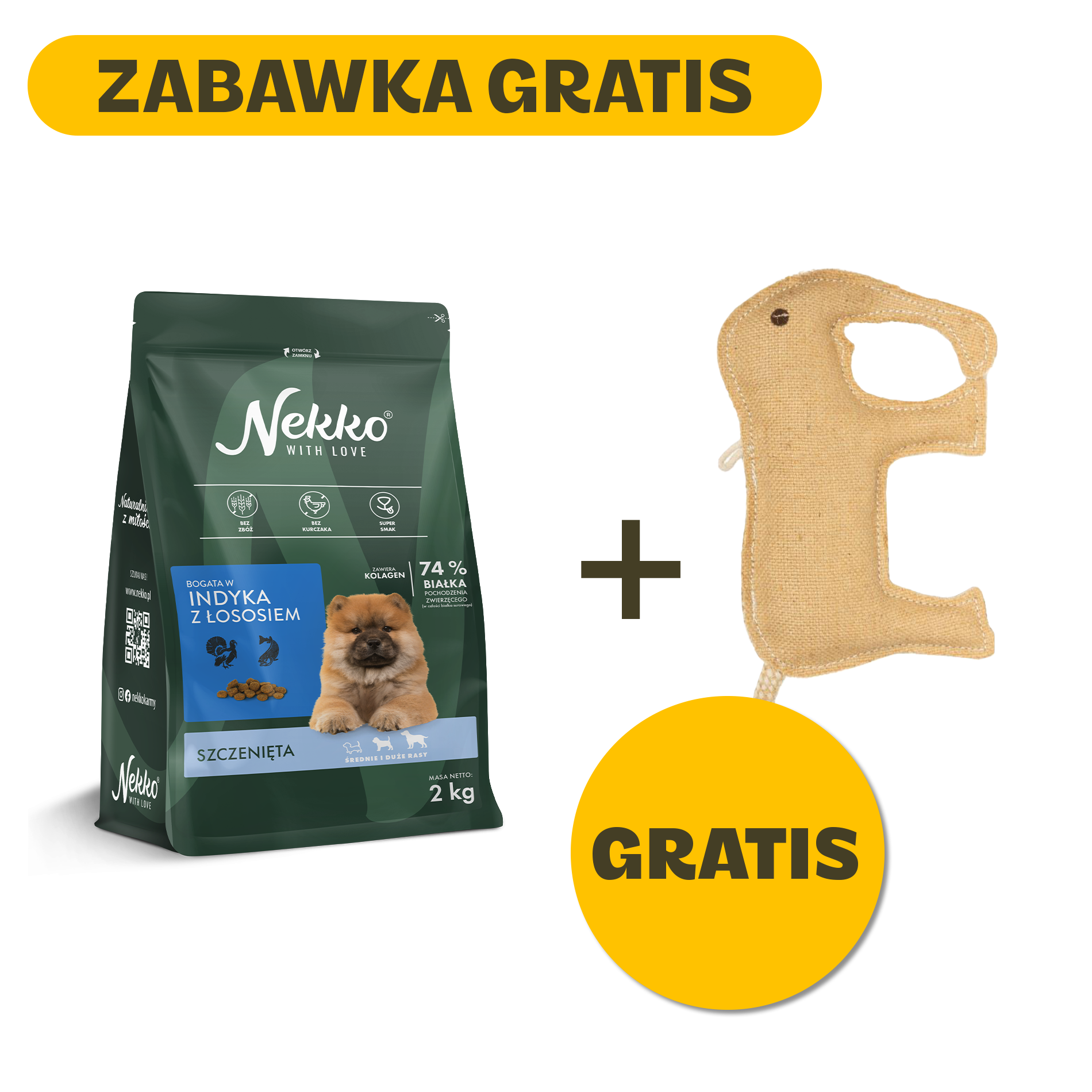 NEKKO karma sucha dla szczeniąt bogata w indyka z łososiem + Zabawka z juty Chico Trend – Słoń 15 cm